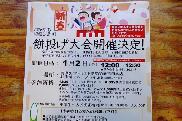 新吉田にある「お酒のアトリエ吉祥本店」で、2026年も年明けに「餅投げ大会」が開催されます。