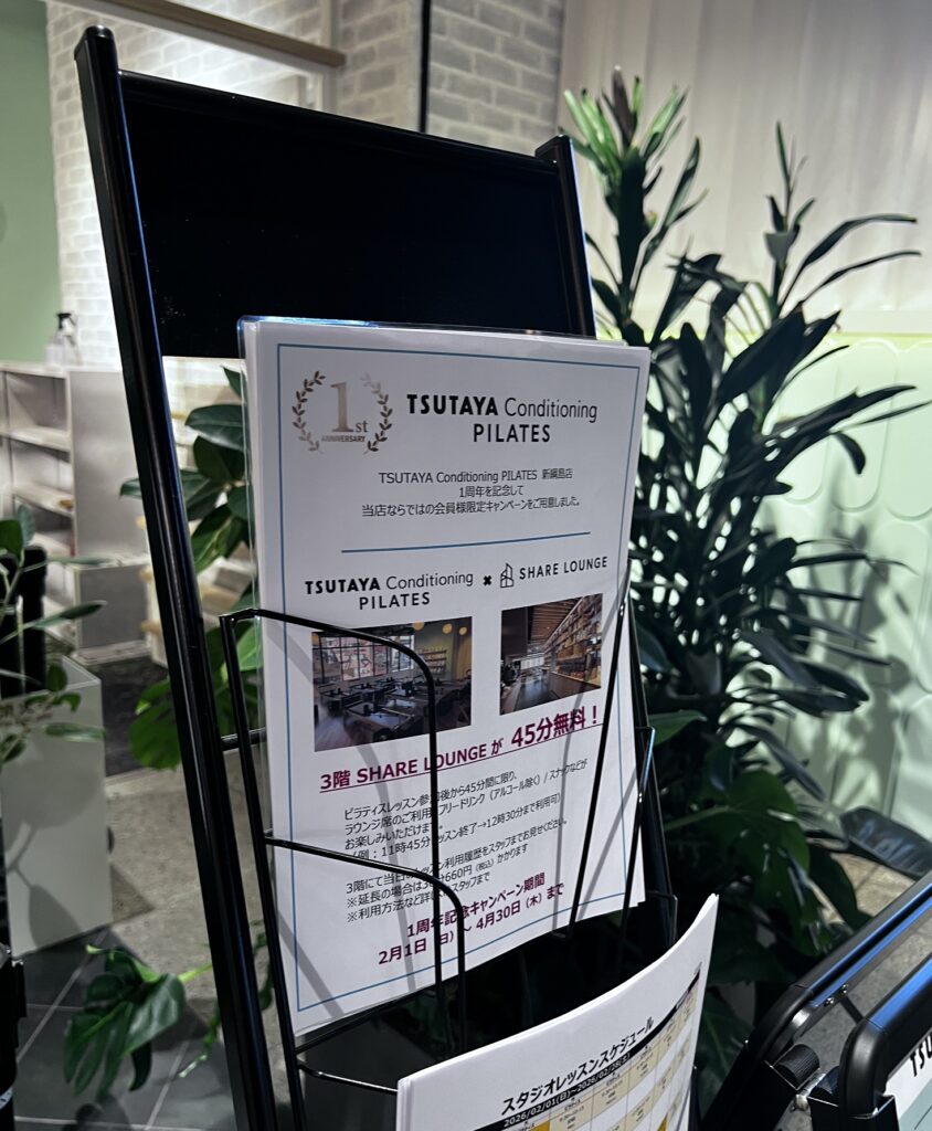 2月1日(日)~4月30日(木)の期間中、ピラティスレッスン参加後から45分間、3階にある「SHARE LOUNGE TSUTAYA BOOKSTORE 新綱島」の利用が無料になるようです。