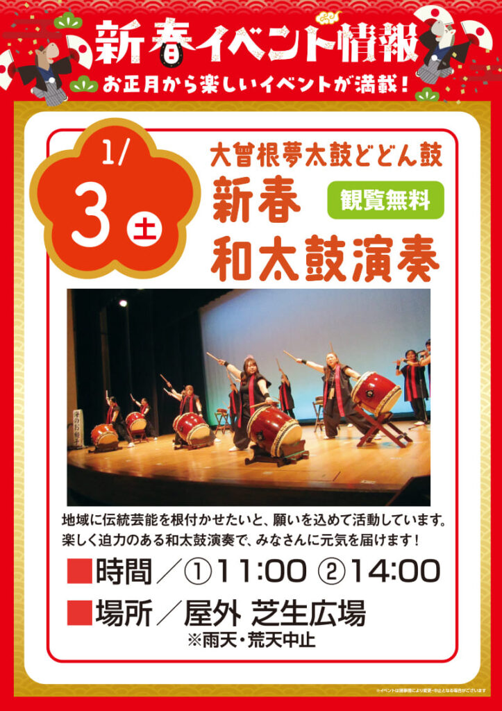 地域に伝統芸能を根付かせたいと願いを込めて活動している「大曽根夢太鼓どどん鼓」による楽しく迫力のある和太鼓演奏で、みなさんに元気を届けます!