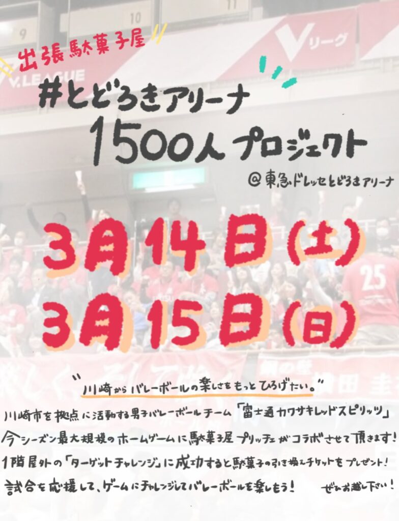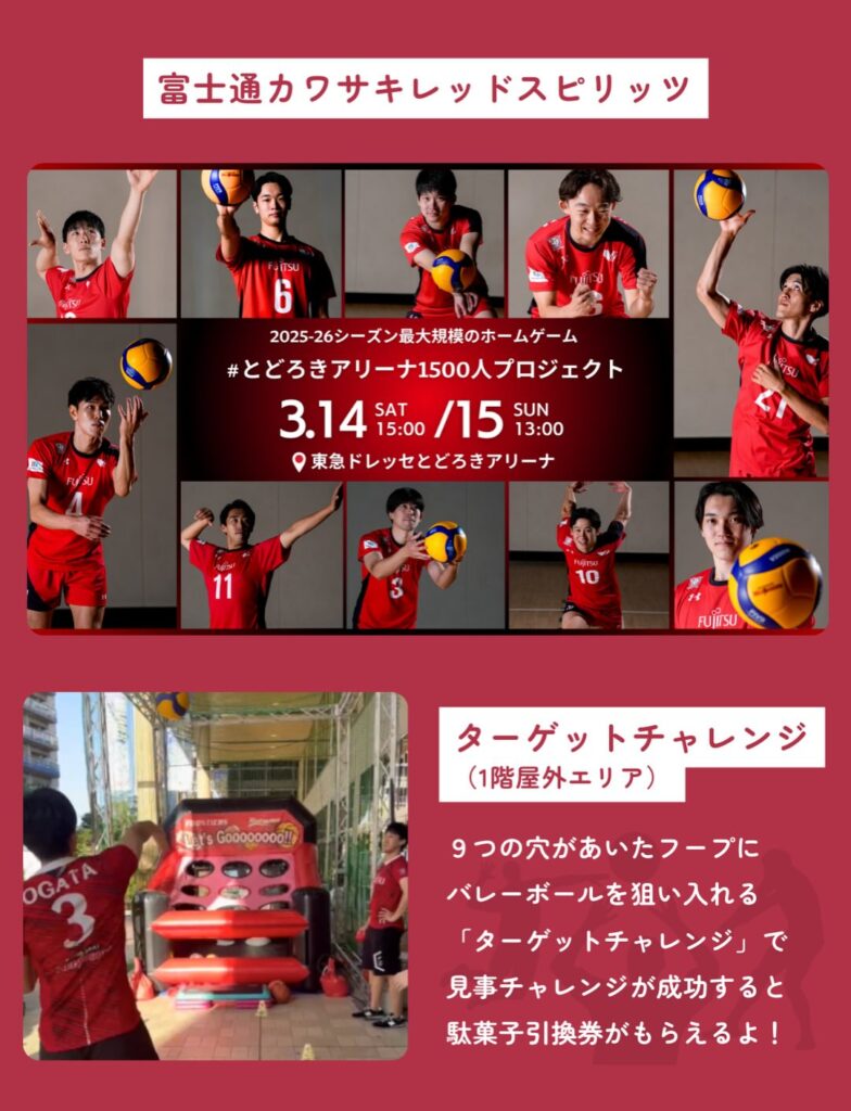 「富士通カワサキレッドスピリッツ」は3月14日(土)~3月15日(日)の2日間、「川崎からバレーボールの楽しさをもっと広げたい」という想いで、今シーズン最大規模のホームゲームで1日1,500名の来場を目指す「とどろきアリーナ来場者1500人プロジェクト」を実施されています。