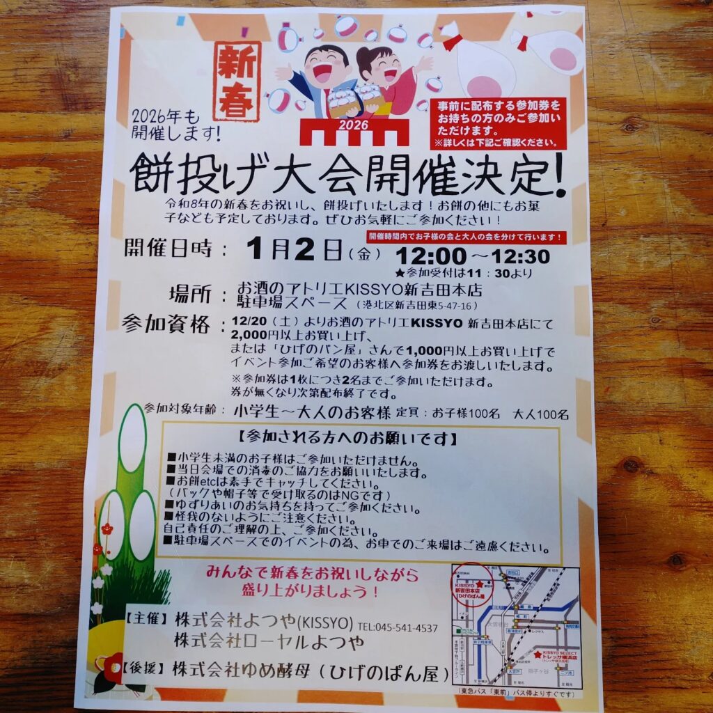 新吉田にある「お酒のアトリエ吉祥本店」で、2026年も年明けに「餅投げ大会」が開催されます。