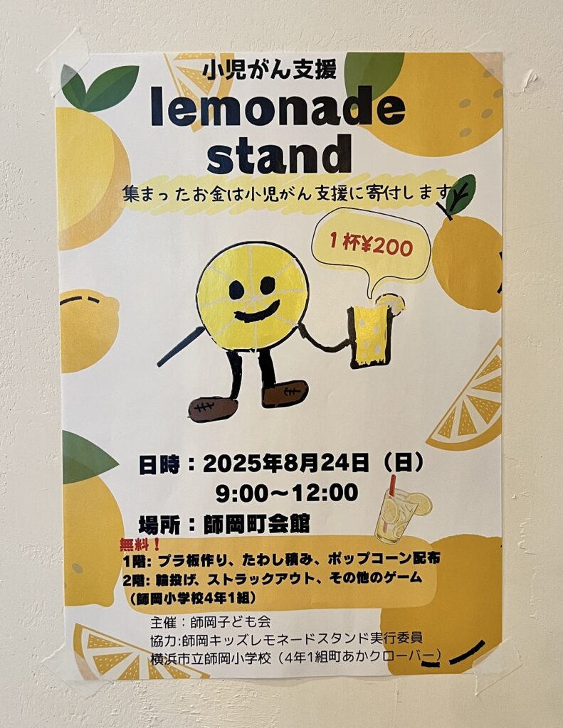 そんなレモネードスタンドが、師岡子ども会の主催で、師岡キッズレモネードスタンド実行委員と、師岡小学校4年1組町あかクローバーの協力のもと開催されます。