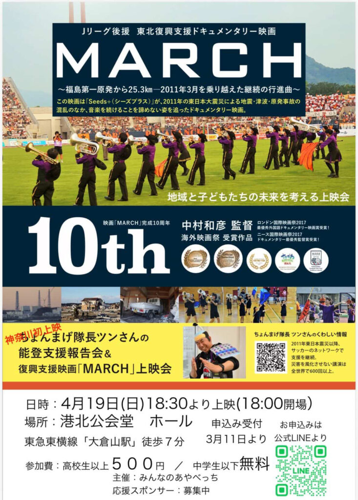 「あの日のことを、忘れないこと。そして、これから何ができるかを考えること。」その一つとして、港北区を拠点に活動している「みんなのあやべっち」が、能登支援報告会&東北復興支援ドキュメンタリー映画「MARCH」の上映会を開催されます。