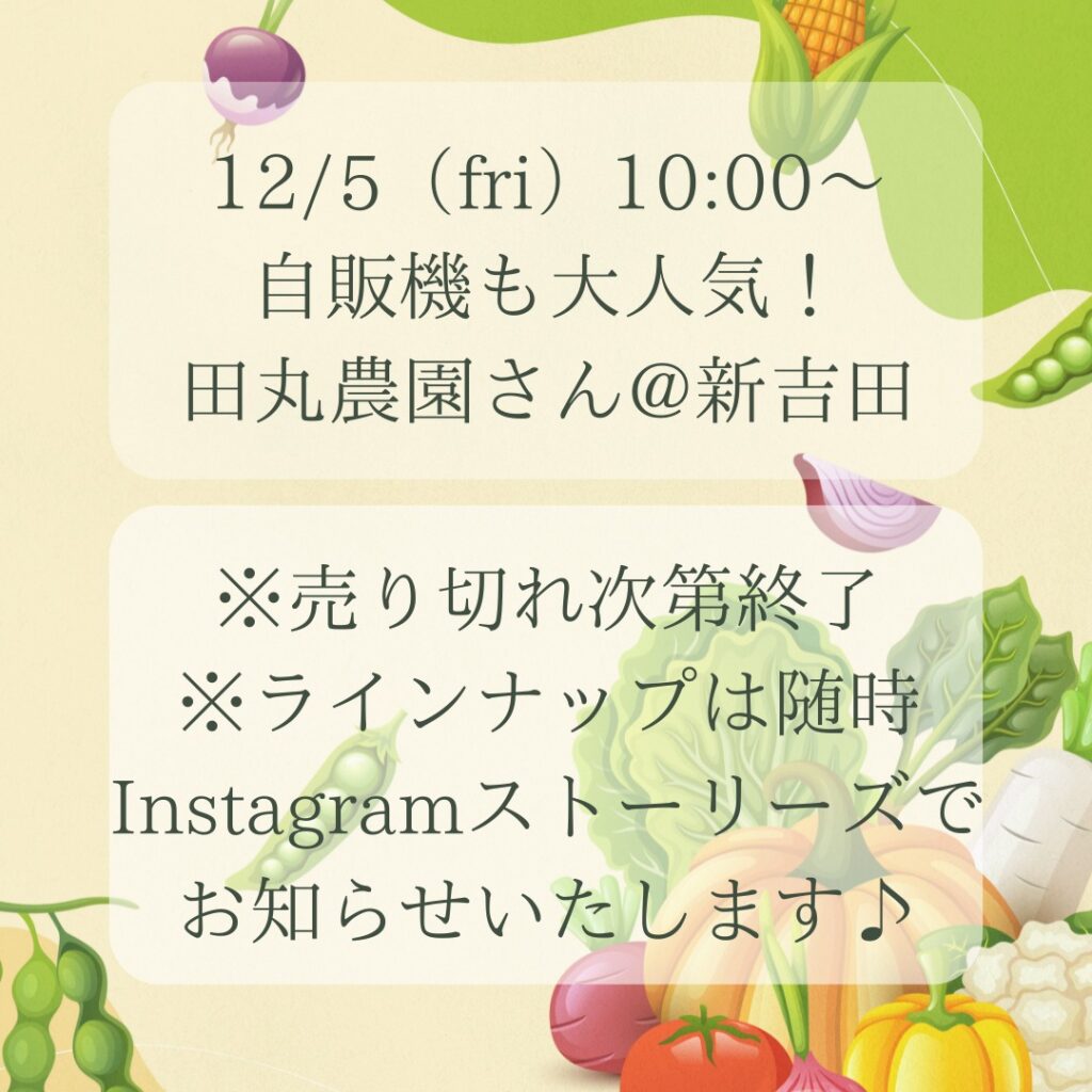 今年最後になりそうな12月の開催は12月5日(金)で、新吉田にある「田丸農園」のお野菜を販売されます。