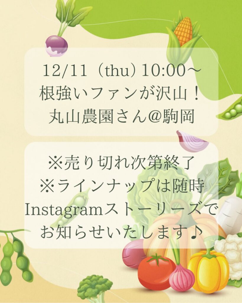 今度こそ今年ラストになりそうな12月2度目の開催は、12月11日(木)で、駒岡にある「丸山農園」のお野菜を販売されます。
