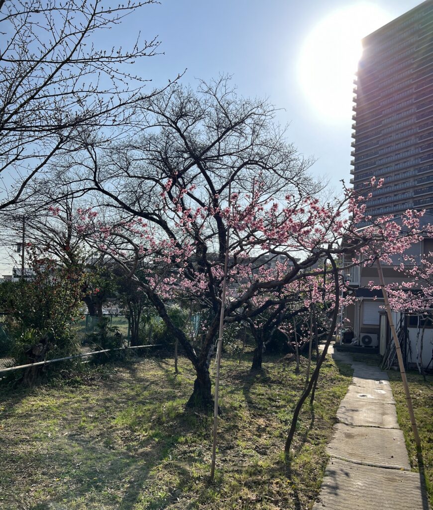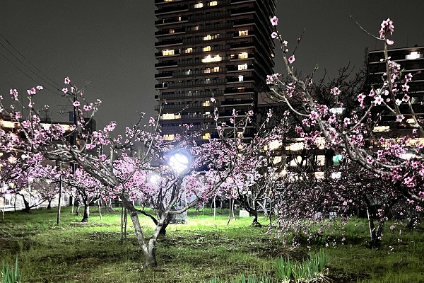タワマンをバックに夜の桃のお花見というのもなかなか幻想的ですよ。