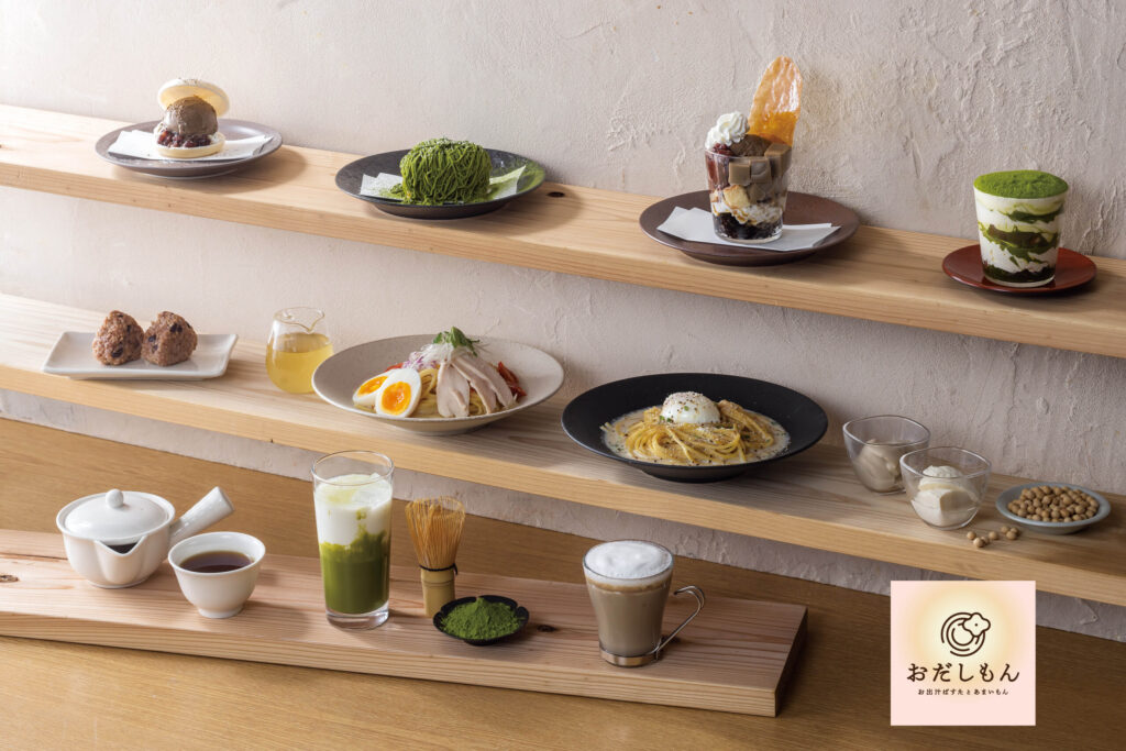 「おだしもん」では、店内で仕込む本格的な「お出汁」をベースに作ったパスタと、和スイーツでお客さまをお迎えいたします。パスタメニューは「かけパスタ」「つけパスタ」など楽しみ方は色々。日本の料理で馴染みのあるお出汁を使ったパスタは毎日でも食べたくなる、まろやかで深い味わいを生み出します。その「旨味」をぜひご堪能ください。