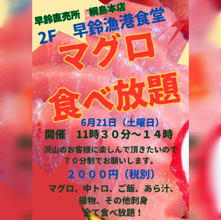 開催日時は6月21日(土)11:30~14:00で、マグロ、中トロ、ご飯、あら汁、揚げ物、その他のお刺身が全て食べ放題!