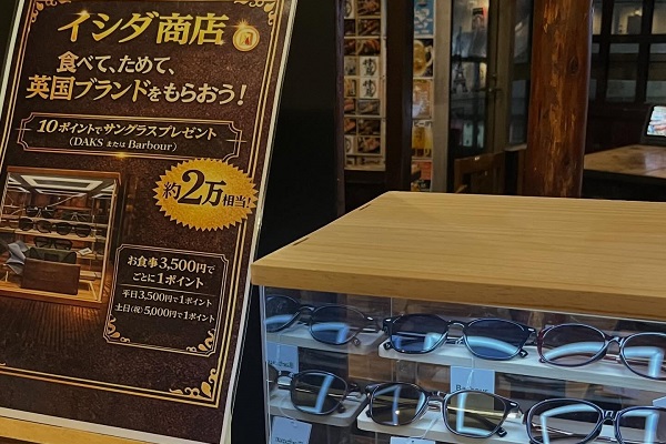 なんと、ご来店時のお会計金額おひとり様3,500円(休日は5,000円)ごとに1ポイントが付いて、10ポイント貯めると「DAKS」か「Barbour」のサングラスのプレゼントがあるのだとか!