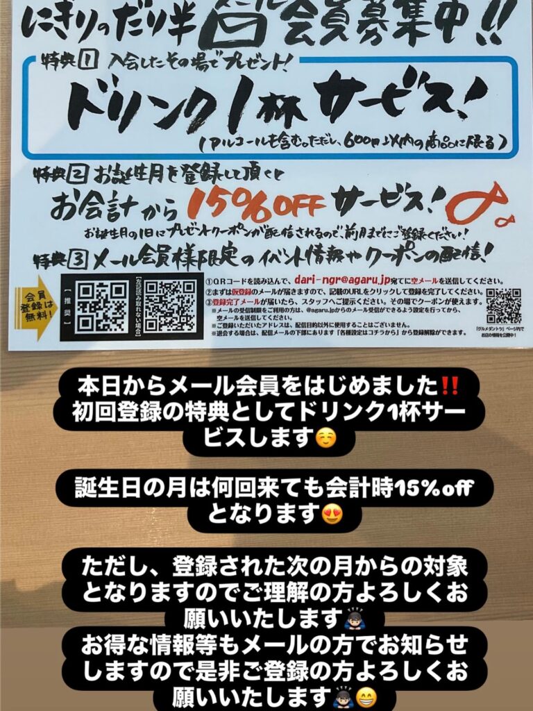 ドリンク1杯サービス&誕生月15%OFF!「にぎりのだり半」メール会員