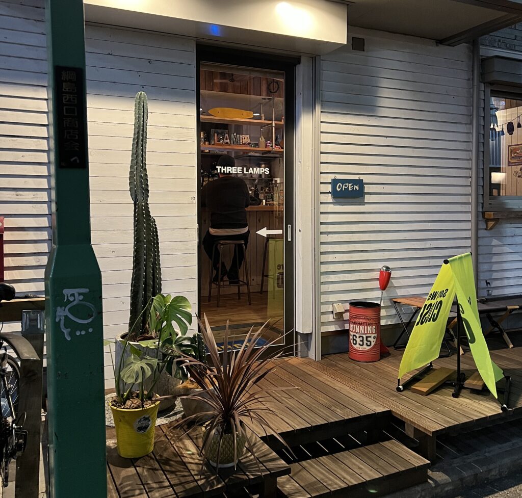 綱島駅西口側の商店街にあるスタンディングバー「THREE LAMPS TIME(スリーランプ)」。